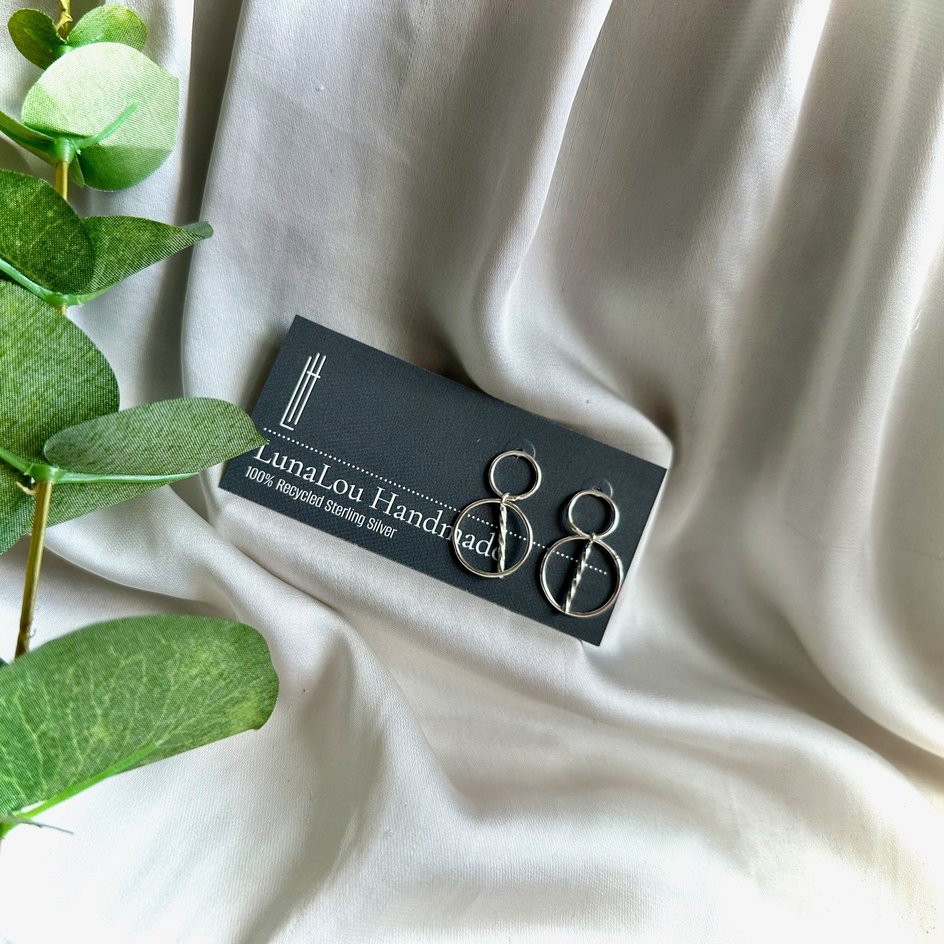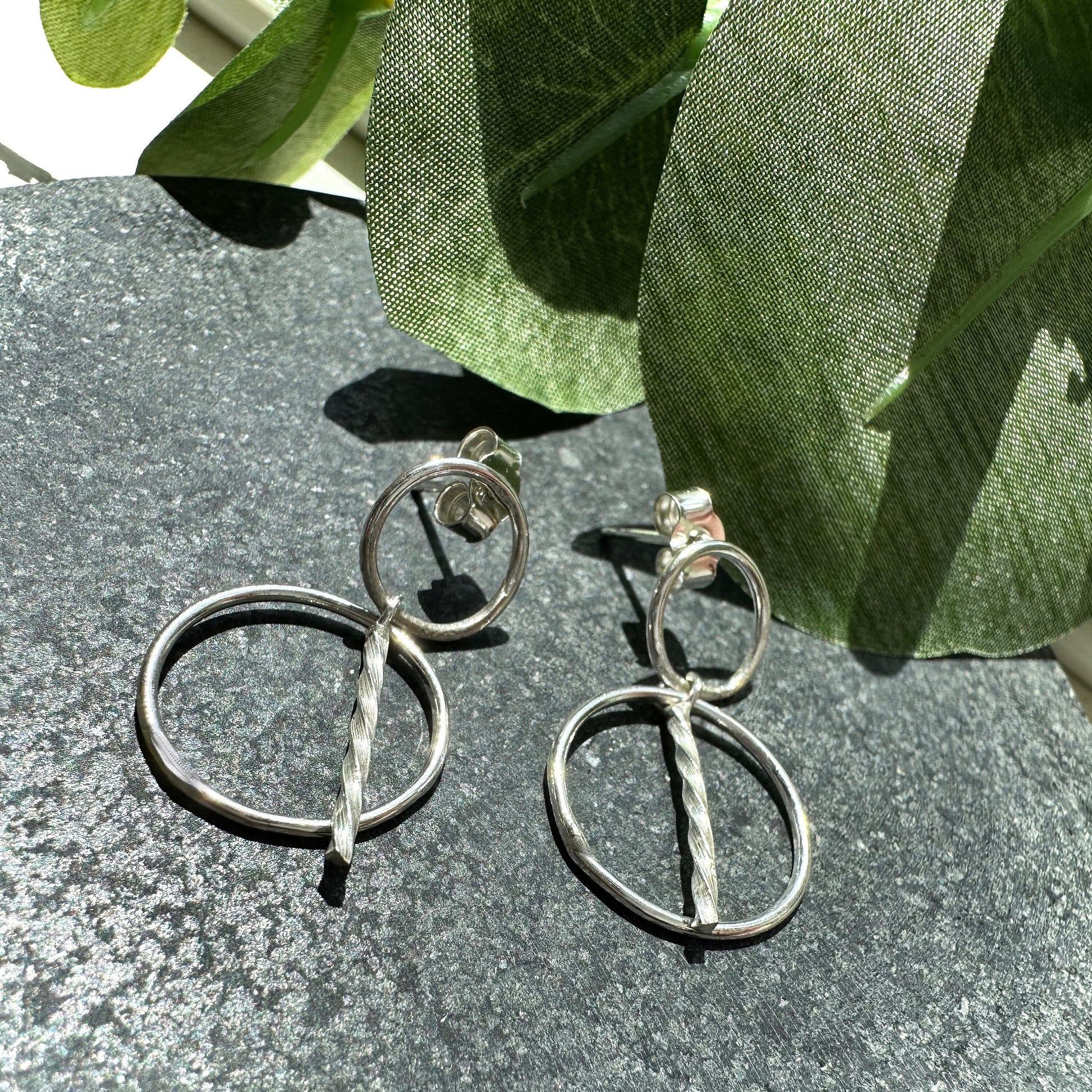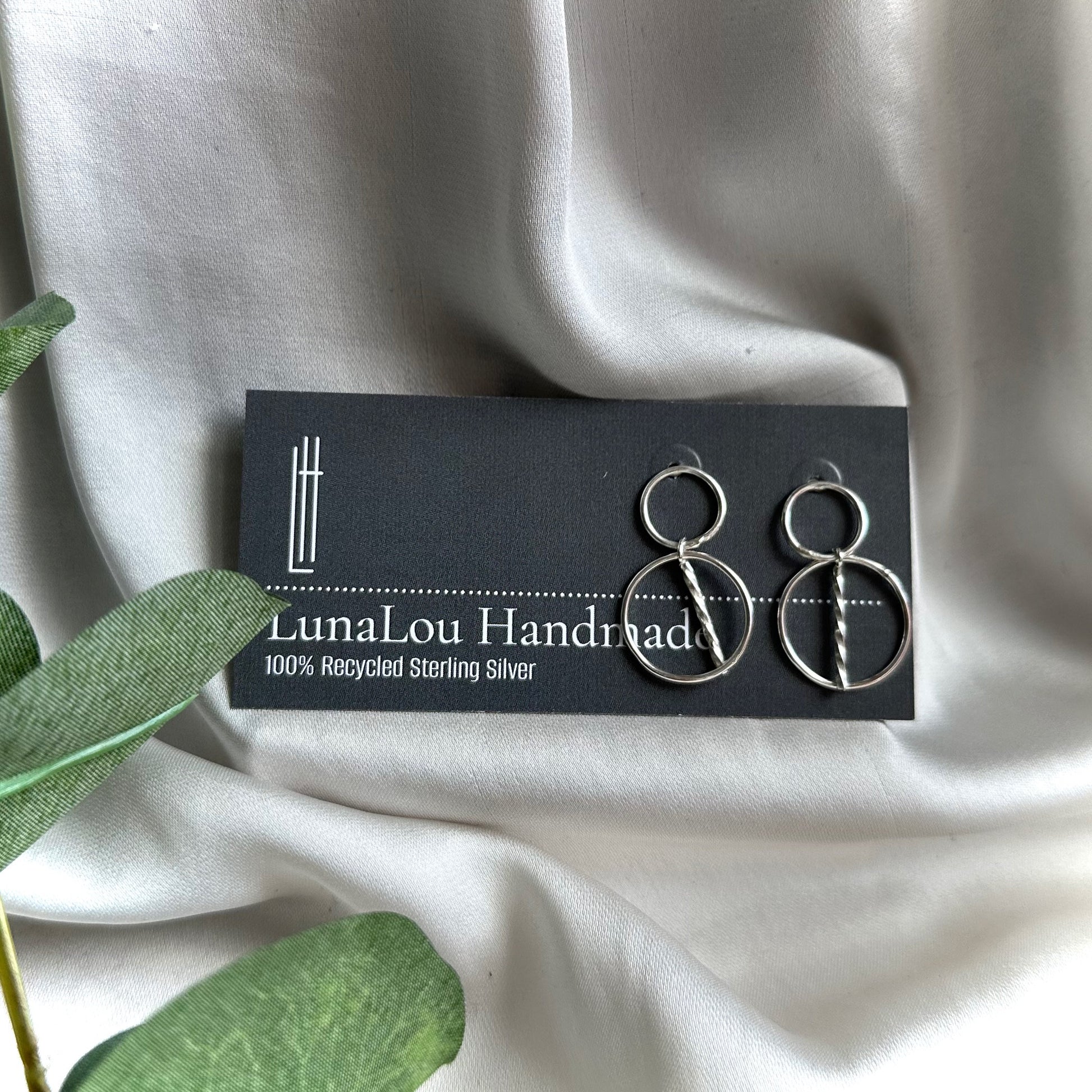 The Double Hooped Sterling Silver Earrings with a twisted dangle, offer a contemporary and minimalist look. Made from 100% recycled sterling silver, these earrings feature a sleek, geometric design. Ideal for modern art lovers, professional environments, or trendy outings.
