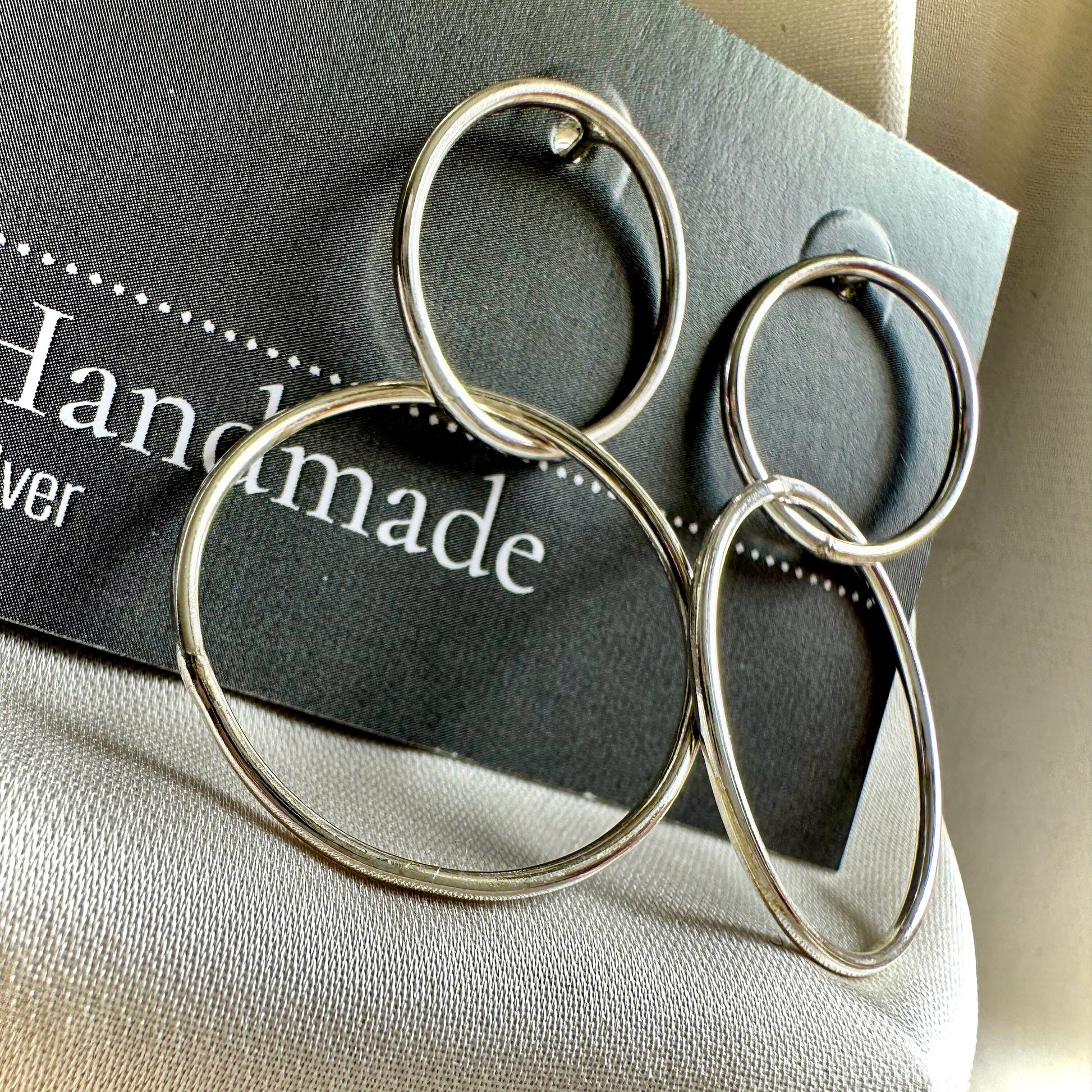 Versatile and chic, our Large and Small Round double hoop Earrings are crafted from 100% recycled sterling silver. These earrings feature a unique design with both large and small round pins, offering a modern twist on a classic look. Perfect for any event, from casual lunches to formal dinners.
